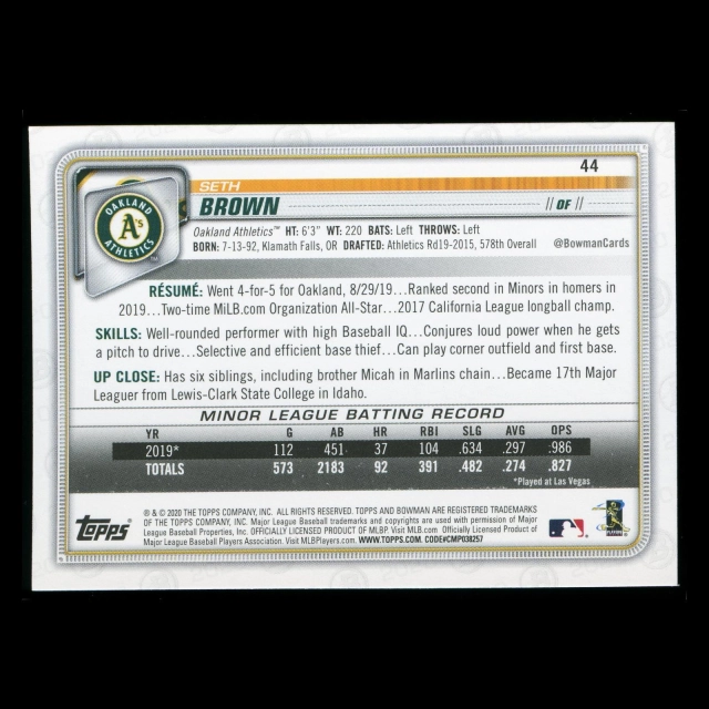 Seth Brown RC 2020 Bowman Rookie Athletics