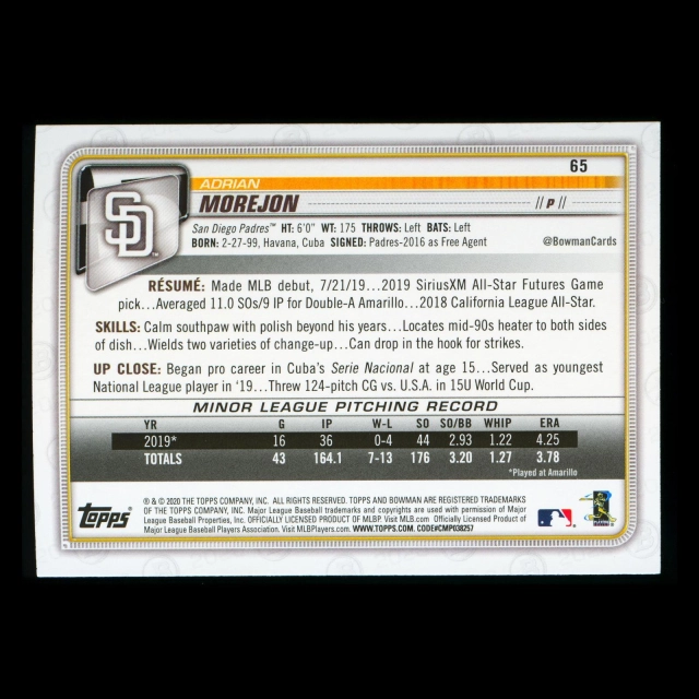 Adrian Morejon RC 2020 Bowman Rookie Padres