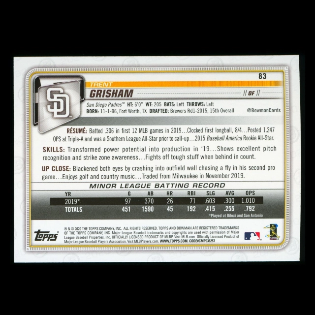 Trent Grisham RC 2020 Bowman Rookie Padres