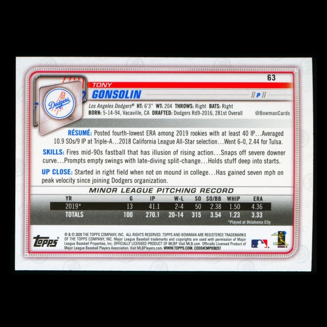 Tony Gonsolin RC 2020 Bowman Rookie Dodgers