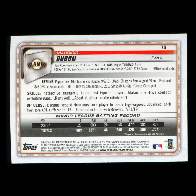 Mauricio Dubon RC 2020 Bowman Rookie Giants