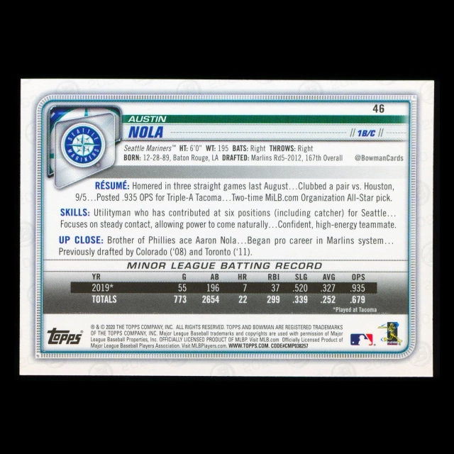 Austin Nola RC 2020 Bowman Rookie Mariners