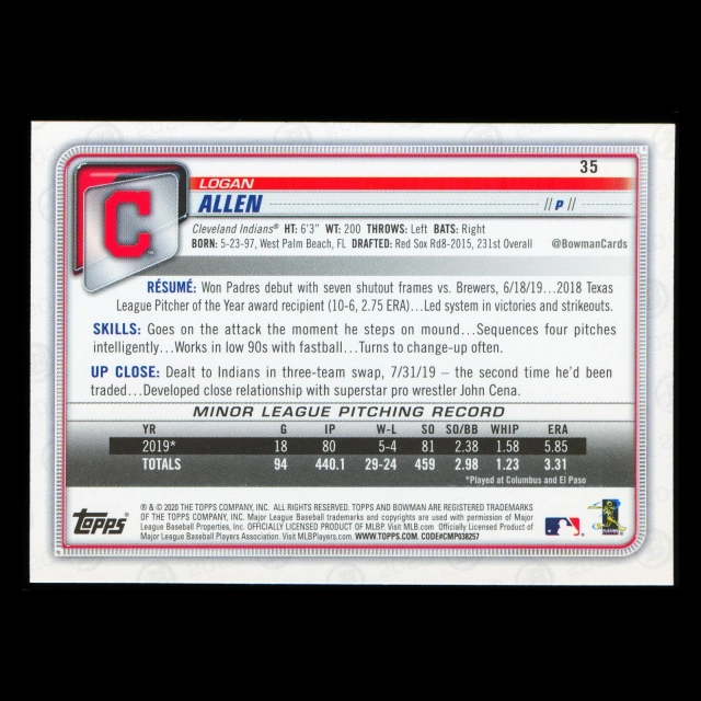 Logan Allen RC 2020 Bowman Rookie Indians