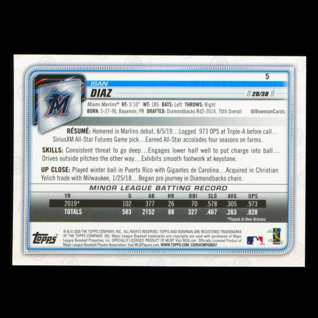 Isan Diaz RC 2020 Bowman Rookie Marlins