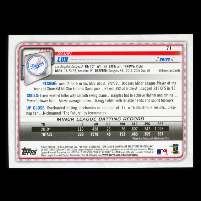 Gavin Lux RC 2020 Bowman Rookie Dodgers