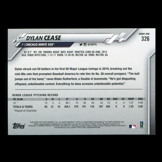 Dylan Cease RC 2020 Topps Rookie White Sox