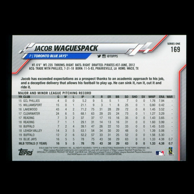 Jacob Waguespack RC 2020 Topps Rookie Blue Jays