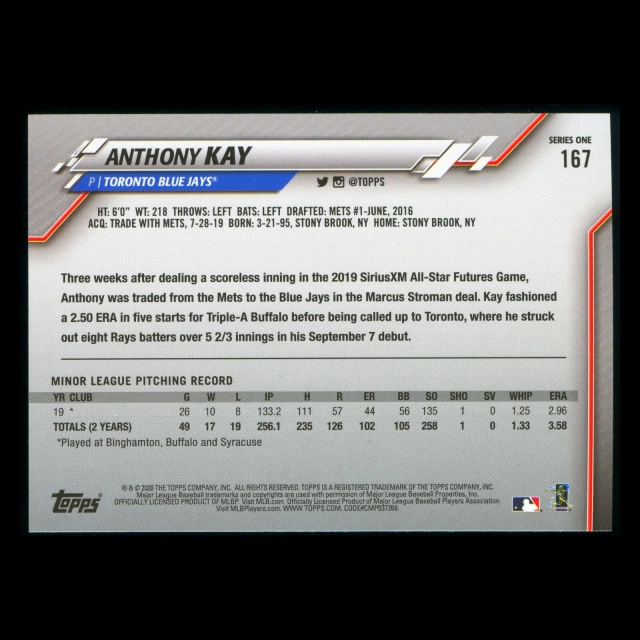 Anthony Kay RC 2020 Topps Rookie Blue Jays