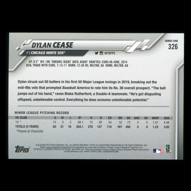 Dylan Cease RC 2020 Topps Rookie White Sox