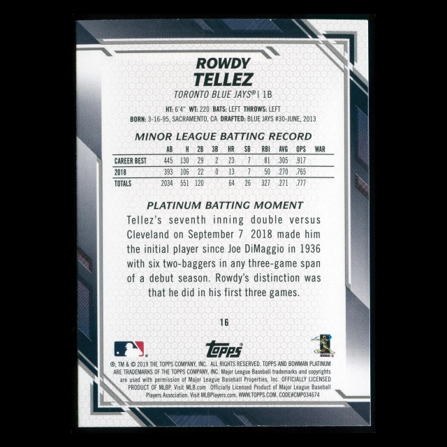 Rowdy Tellez RC 2019 Bowman Platinum Rookie Blue Jays