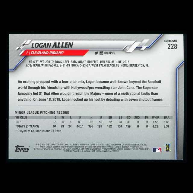 Logan Allen RC 2020 Topps Rookie Indians