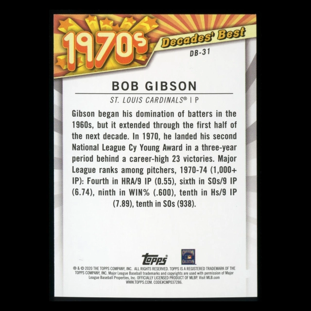 Bob Gibson 2020 Topps Decades' Best Pitchers 1970s Cardinals