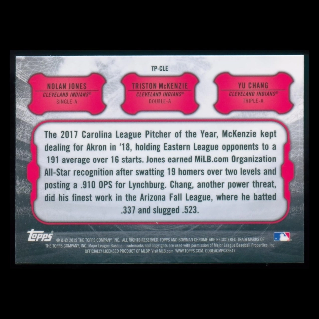 Nolan Jones | Trison McKenzie | Yu Chang RC 2019 Bowman Chrome Talent Pipeline Indians