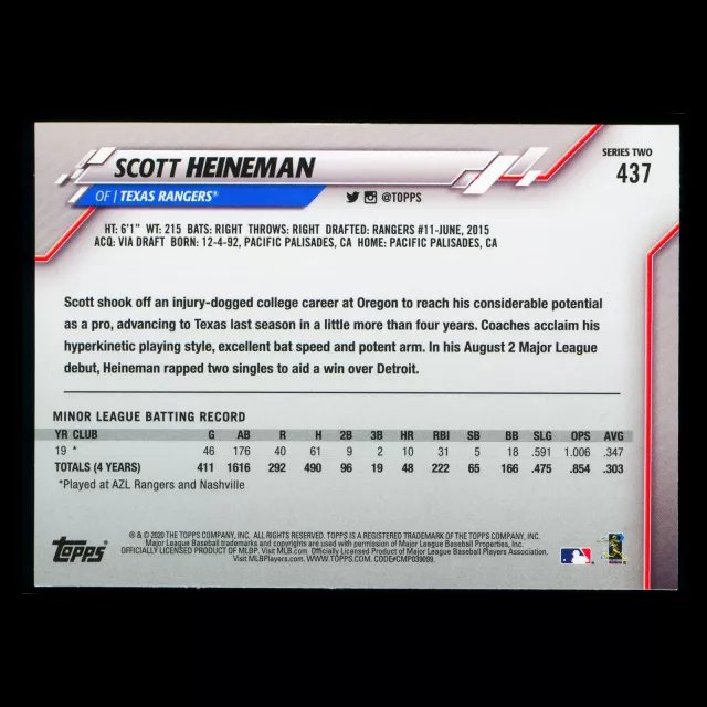 Scott Heineman RC 2020 Topps Rookie Inaugural Season Rangers