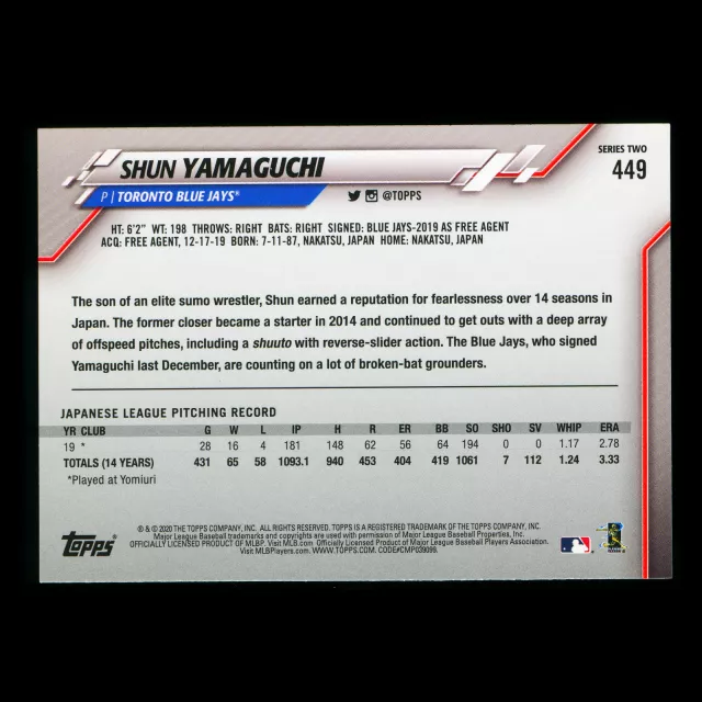 Shun Yamaguchi RC 2020 Topps Rookie Blue Jays
