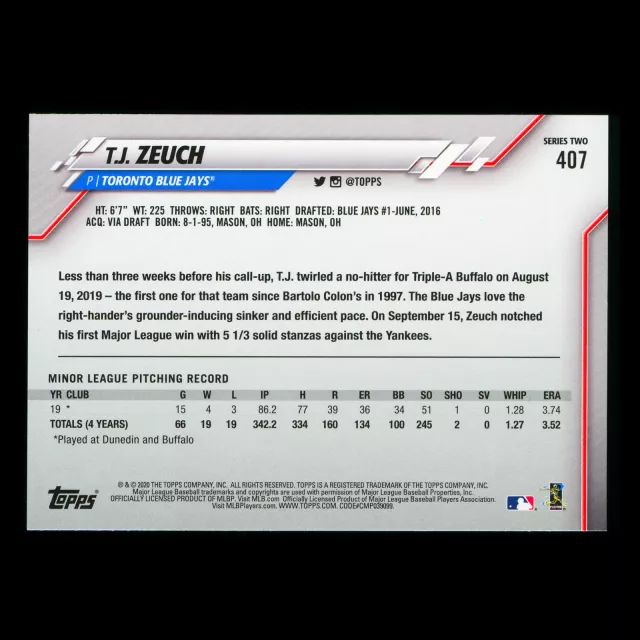T.J. Zeuch RC 2020 Topps Rookie Blue Jays