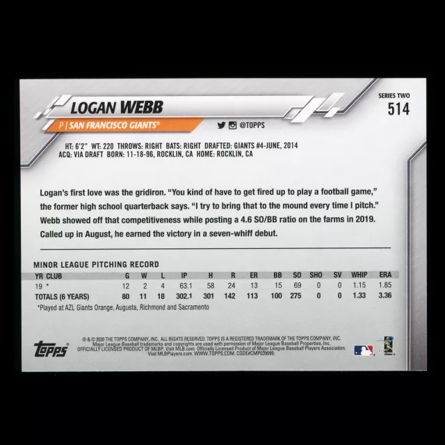Logan Webb RC 2020 Topps Rookie Giants