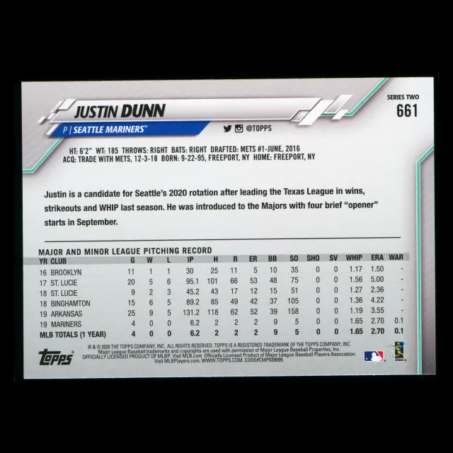 Justin Dunn RC 2020 Topps Rookie Mariners