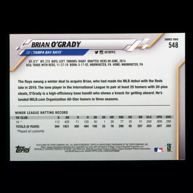 Brian O'Grady RC 2020 Topps Rookie Rays