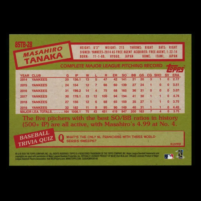 Masahiro Tanaka 2020 Topps 1985 Retro Yankees