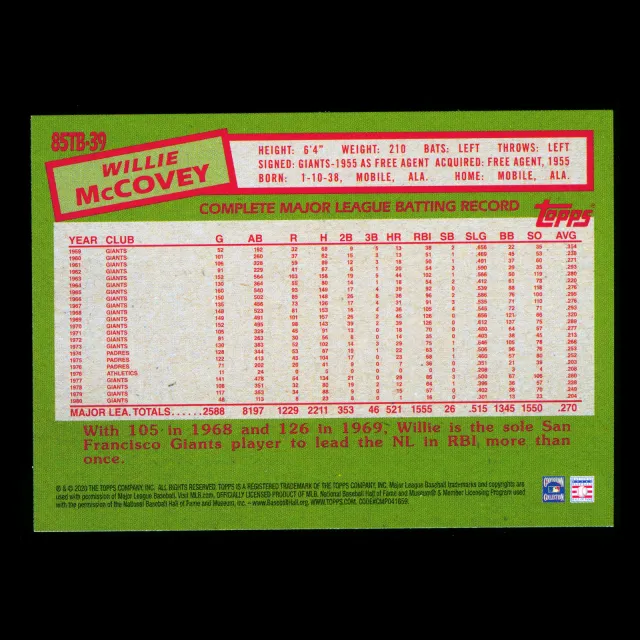 Willie McCovey 2020 Topps 1985 Retro Giants