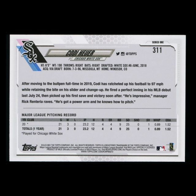 Codi Heuer RC 2021 Topps Rookie White Sox