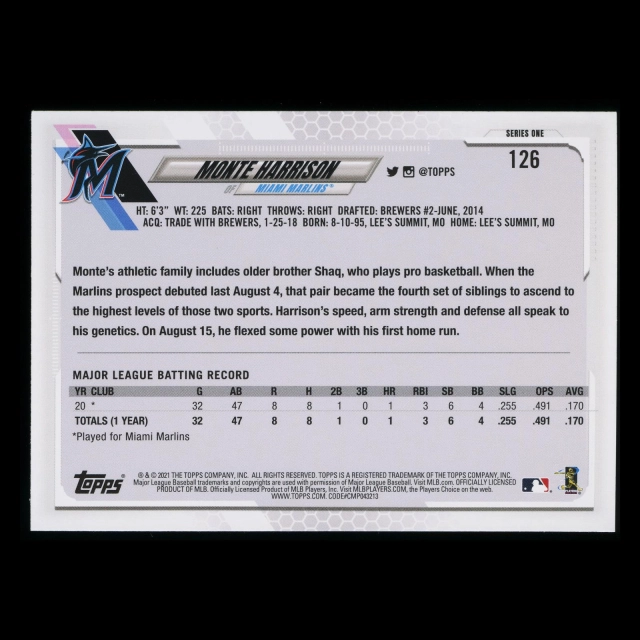 Monte Harrison RC 2021 Topps Rookie Marlins