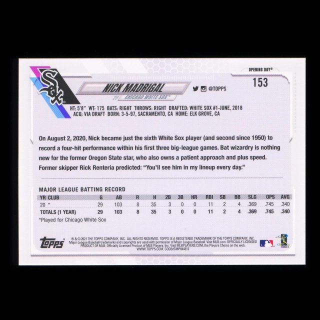 Nick Madrigal RC 2021 Topps Opening Day April 1, 2021 Blue Foil White Sox