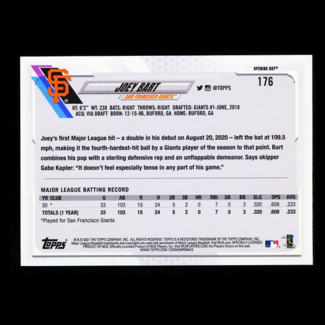 Joey Bart RC 2021 Topps Opening Day Rookie Giants