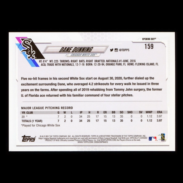 Dane Dunning RC 2021 Topps Opening Day Rookie White Sox