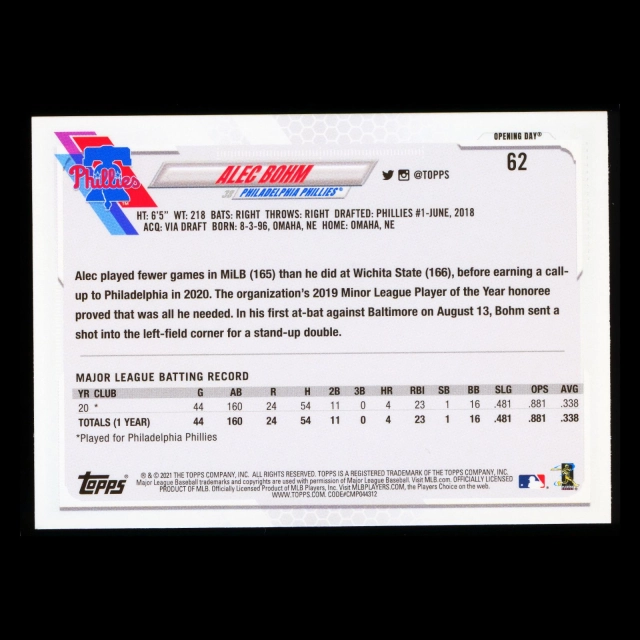 Alec Bohm RC 2021 Topps Opening Day All-Star Rookie Phillies