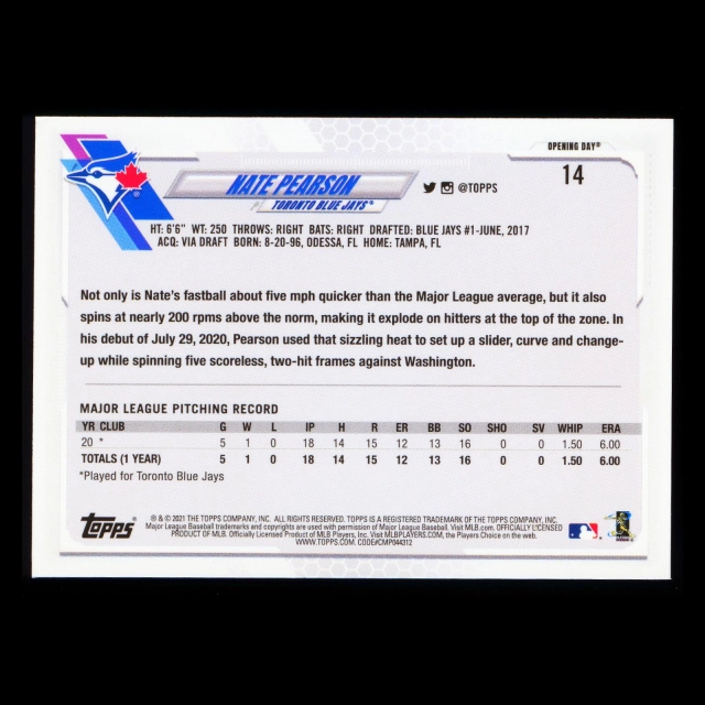 Nate Pearson RC 2021 Topps Opening Day Rookie Blue Jays