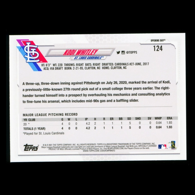 Kodi Whitley RC 2021 Topps Opening Day Rookie Cardinals