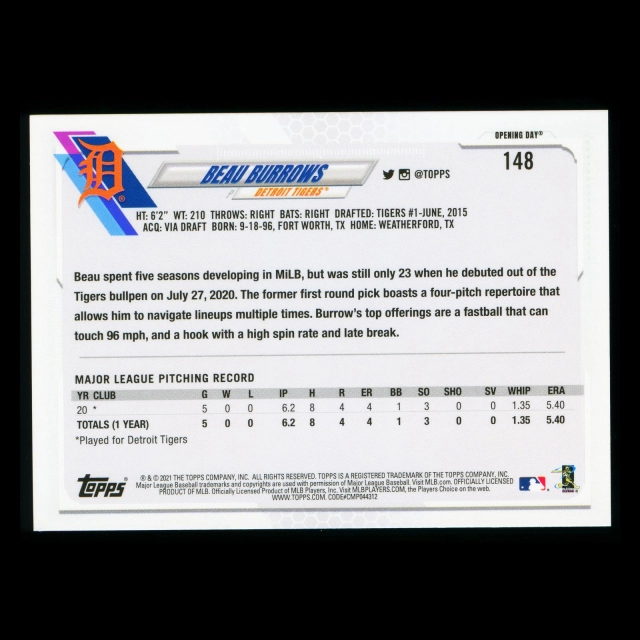 Beau Burrows RC 2021 Topps Opening Day Rookie Tigers