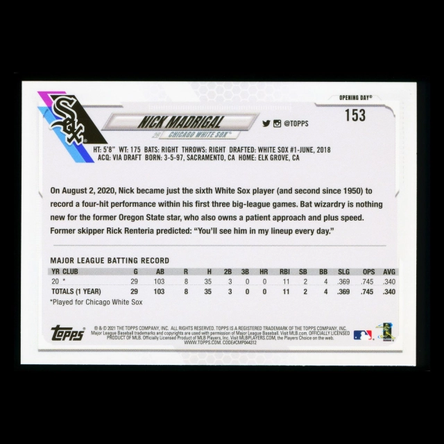 Nick Madrigal RC 2021 Topps Opening Day Rookie White Sox