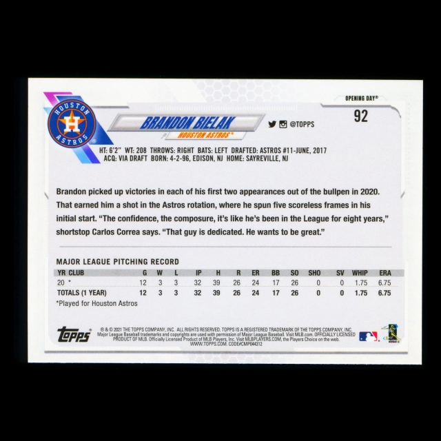 Brandon Bielak RC 2021 Topps Opening Day Rookie Astros