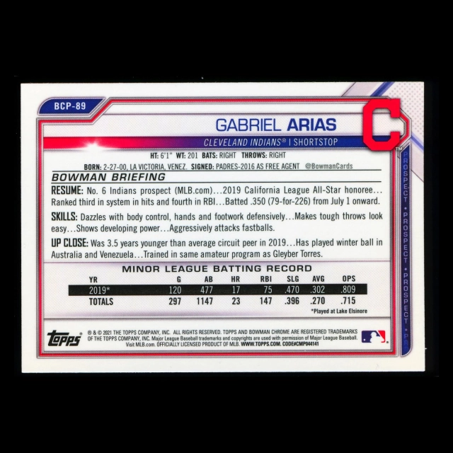 Gabriel Arias 2021 Bowman Chrome 1st Bowman Prospect Indians