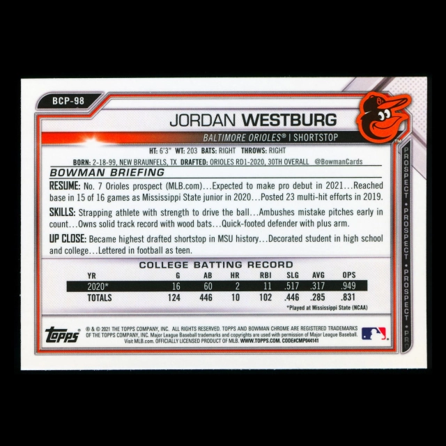 Jordan Westburg 2021 Bowman Chrome Prospect Orioles