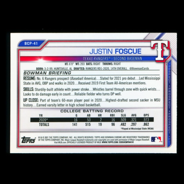 Justin Foscue 2021 Bowman Chrome Prospect Rangers