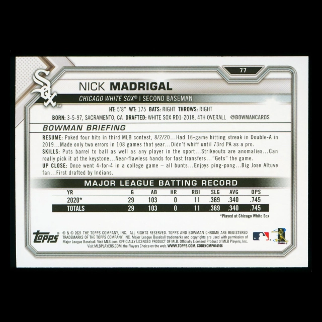 Nick Madrigal RC 2021 Bowman Rookie White Sox