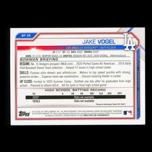 Jake Vogel 2021 Bowman Prospect 1st Bowman Dodgers