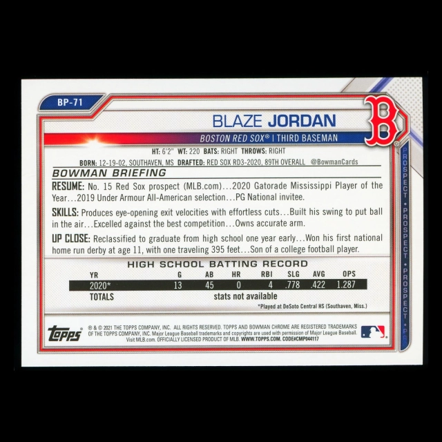 Blaze Jordan 2021 Bowman Prospect 1st Bowman Red Sox