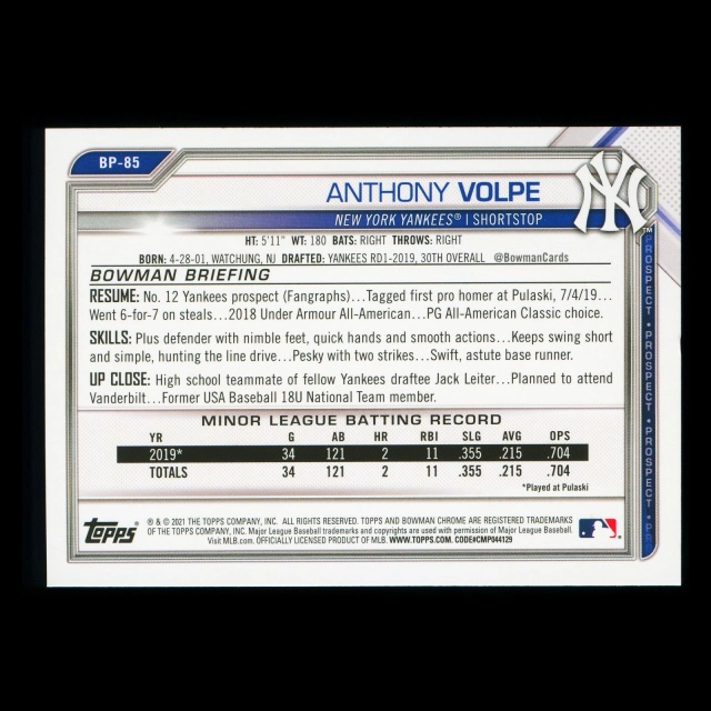 Anthony Volpe 2021 Bowman Prospect Yankees