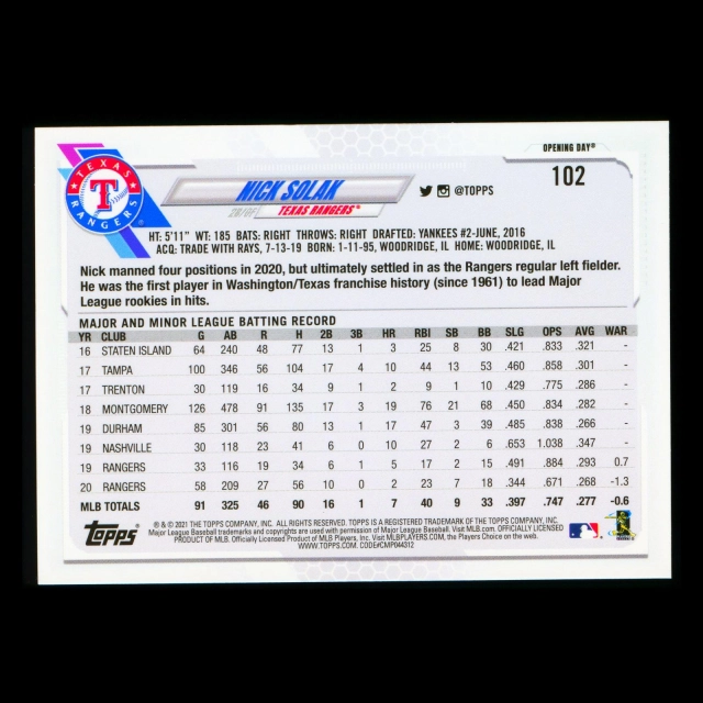 Nick Solak 2021 Topps Opening Day Future Stars Rangers