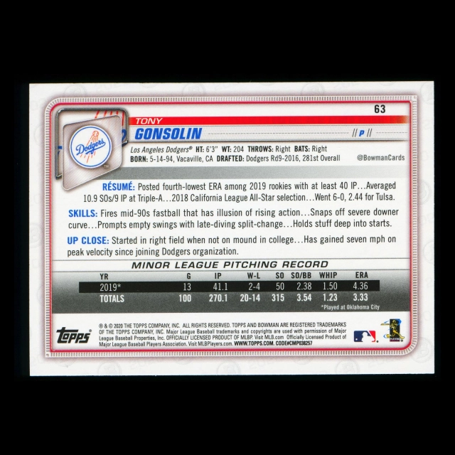 Tony Gonsolin RC 2020 Bowman Rookie Dodgers