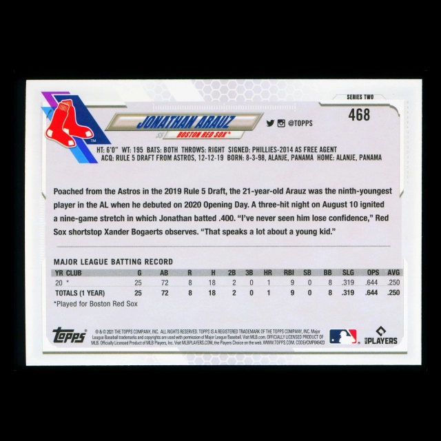 Jonathan Arauz RC Topps 2021 Rookie Red Sox