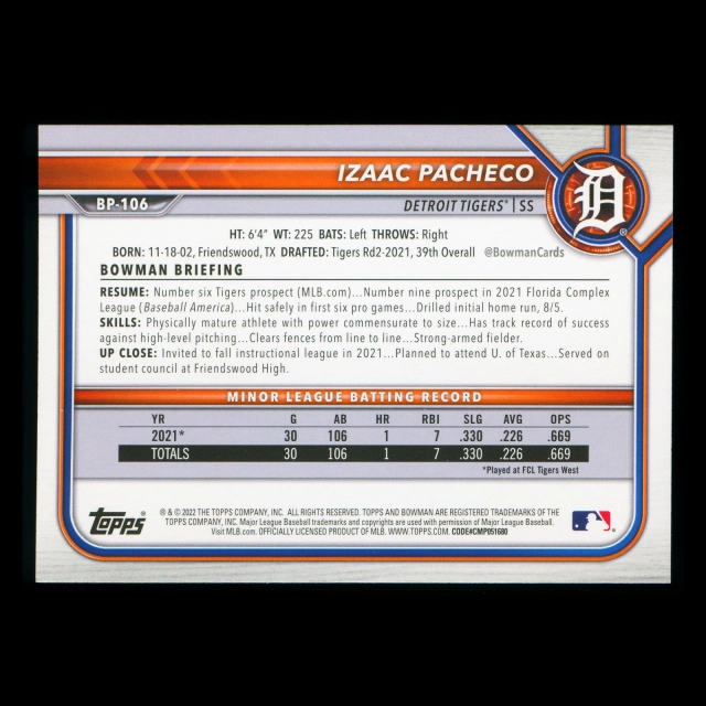 Izaac Pacheco 2022 Bowman Prospects Tigers