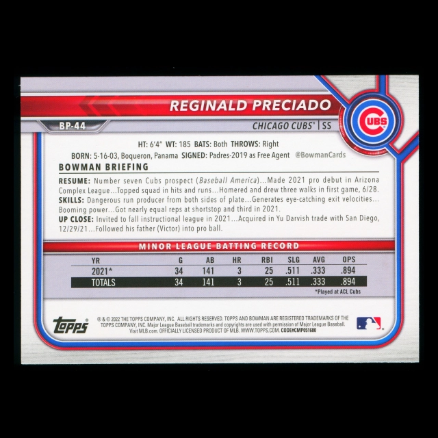 Reginald Preciado 2022 Bowman Prospects Cubs