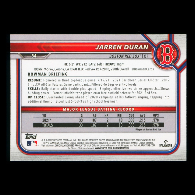 Jarren Duran RC 2022 Bowman Rookie Red Sox