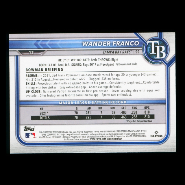 Wander Franco RC 2022 Bowman Rookie Rays